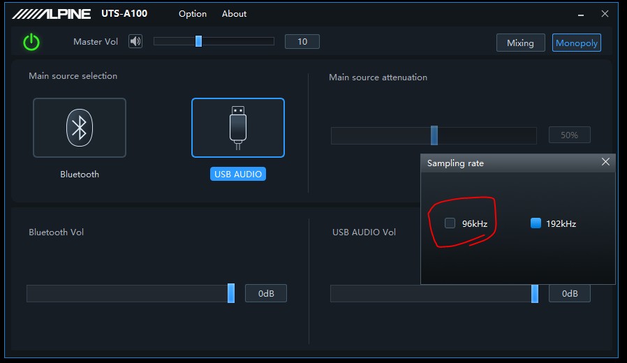UTS A100은 192kHz로 기본 설정되어 있습니다.
